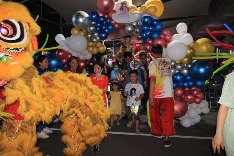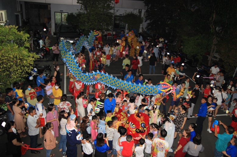 Đặc biệt, các bé được xem biểu diễn múa lân, múa rồng và cùng rước đèn dưới trăng với lân và rồng, không khí thật náo nhiệt.