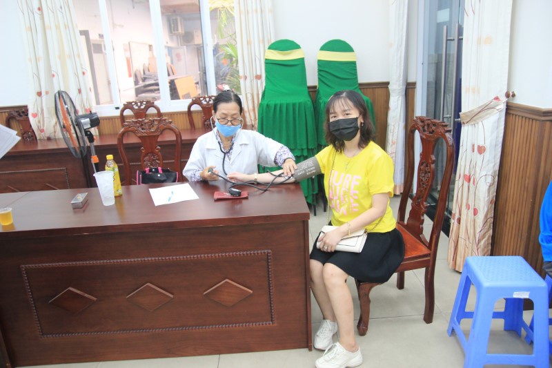 Tại buổi hiến máu, cán bộ, người lao động được các bác sĩ thăm khám sàng lọc và tư vấn sức khỏe trước khi tham gia hiến máu.