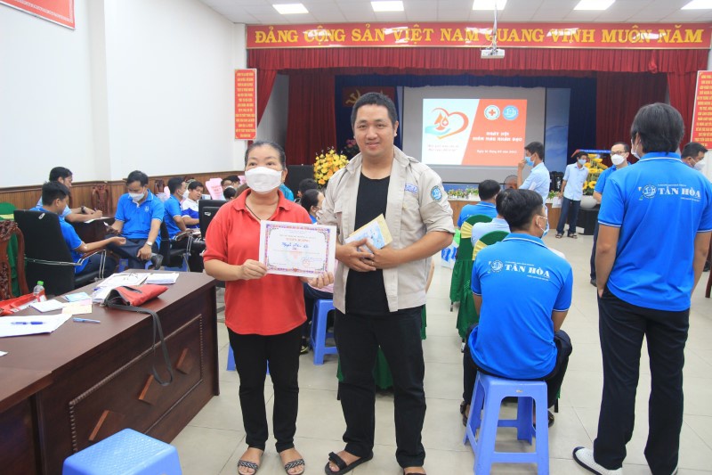 Cán bộ người lao động tham gia hiến máu với túi 450ml được Hội Chữ thập đỏ động viên, tuyên dương tại ngày hội.