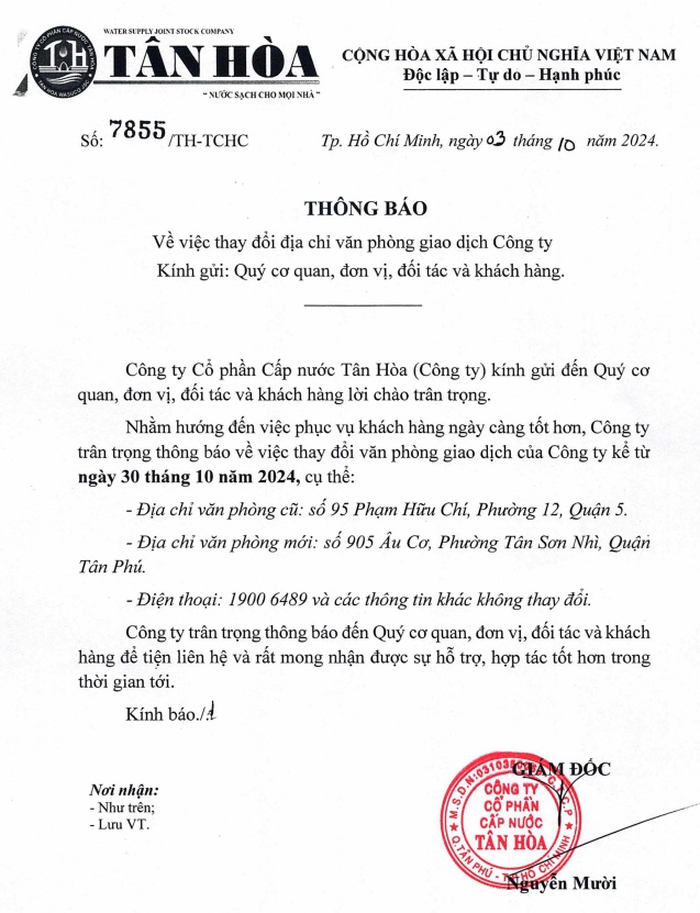 Công ty Cổ phần Cấp nước Tân Hòa xin trân trọng thông báo đến Quý khách lịch nghỉ Tết Nguyên Đán – Giáp Thìn 2024