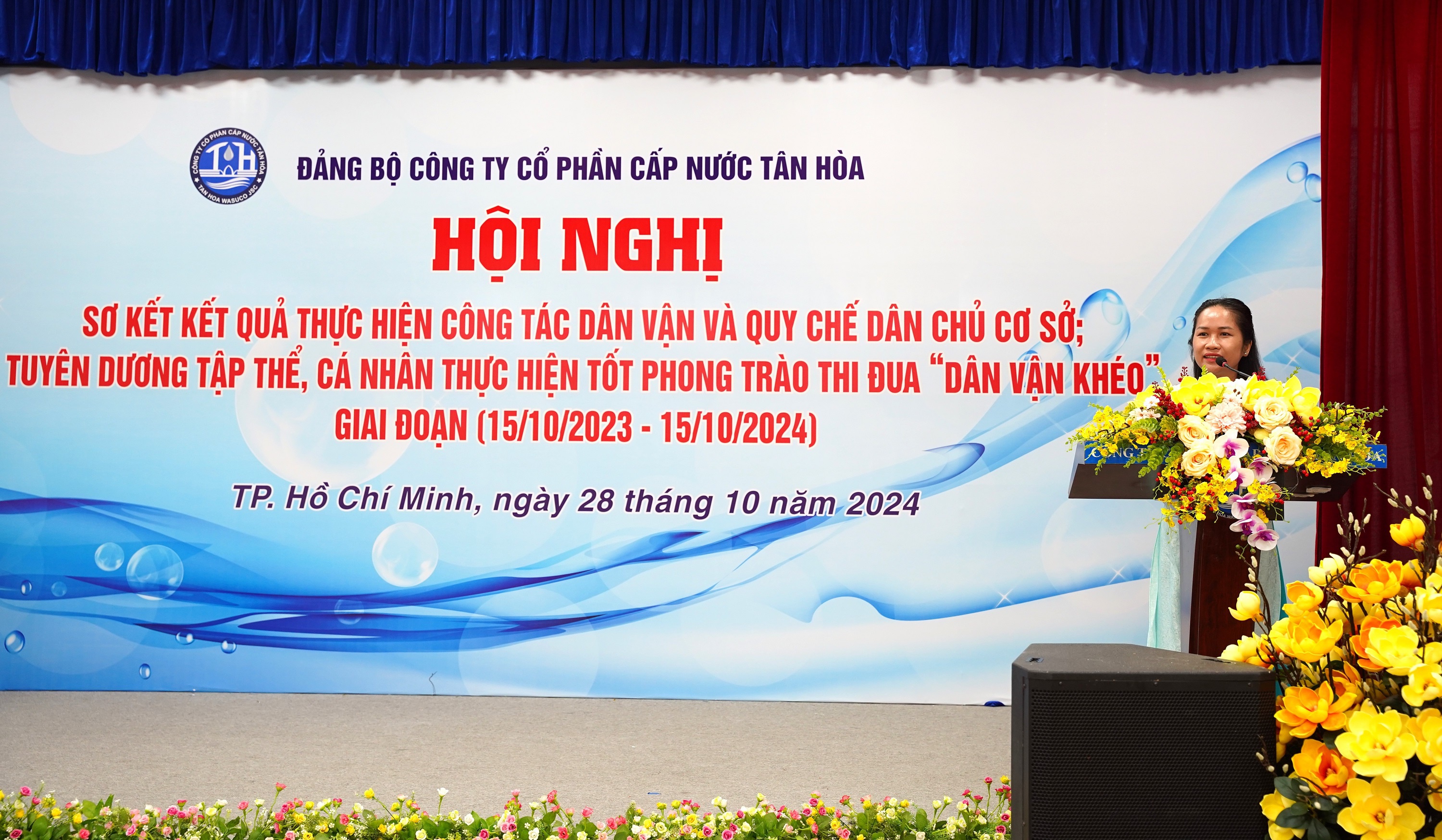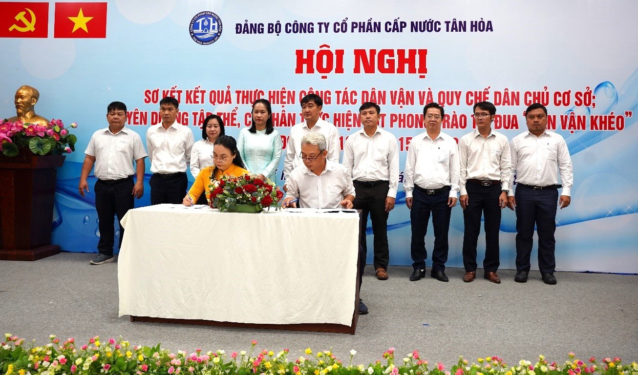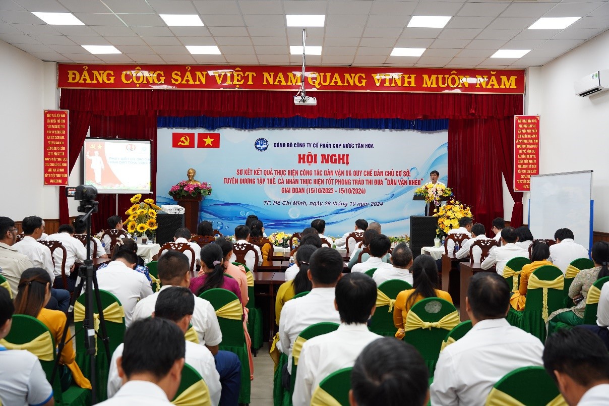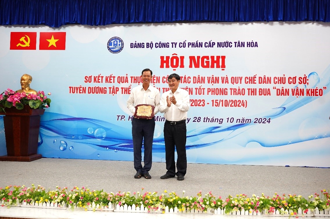 Ngày 28/10/2024, tại hội trường Công ty Cổ phần Cấp nước Tân Hòa, Hội nghị sơ kết kết quả thực hiện công tác dân vận và quy chế dân chủ cơ sở; tuyên dương tập thể, cá nhân thực hiện tốt phong trào thi đua "Dân vận khéo" giai đoạn 15/10/2023 - 15/10/2024 đã diễn ra trang trọng. Buổi lễ có sự tham dự của Đồng chí Lý Bửu Nghĩa - Phó Bí thư Thường trực Đảng ủy Tổng Công ty, Đồng chí Trần Thị Ngọc Luyến - Bí thư Đảng bộ, Chủ tịch HĐQT Công ty, Đồng chí Nguyễn Mười - Phó Bí thư Đảng bộ, Giám đốc Công ty cùng các đồng chí trong Ban Chấp hành Đảng bộ, Ủy ban Kiểm tra Đảng ủy, Trưởng Ban Kiểm soát, Trưởng Phó các Phòng – Đội; Chủ tịch, Phó chủ tịch Công đoàn; Bí thư, Phó Bí thư Đoàn Thanh niên; cùng toàn thể đảng viên của đảng bộ và đại diện các tập thể và cá nhân được biểu dương, khen thưởng cùng tham dự.