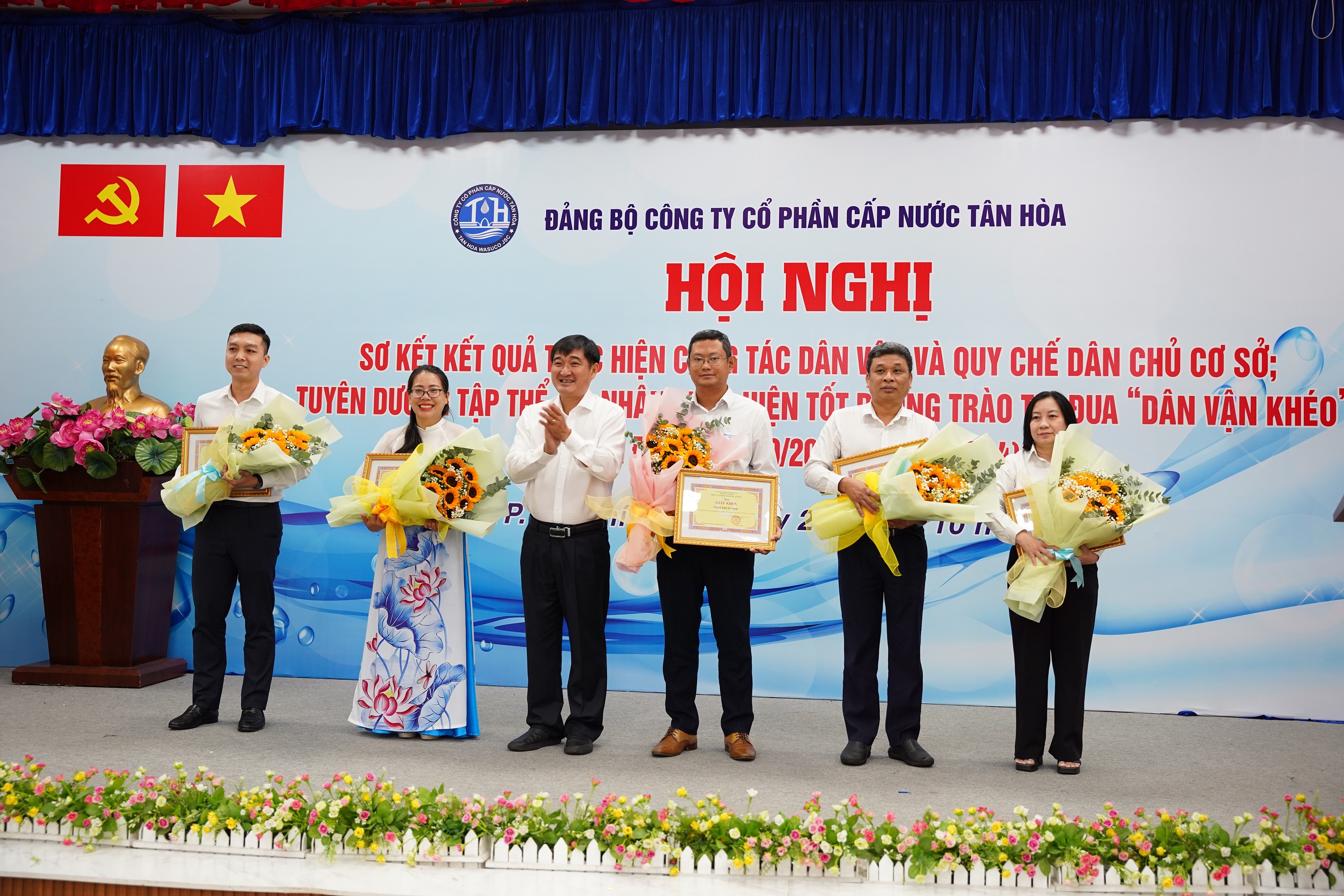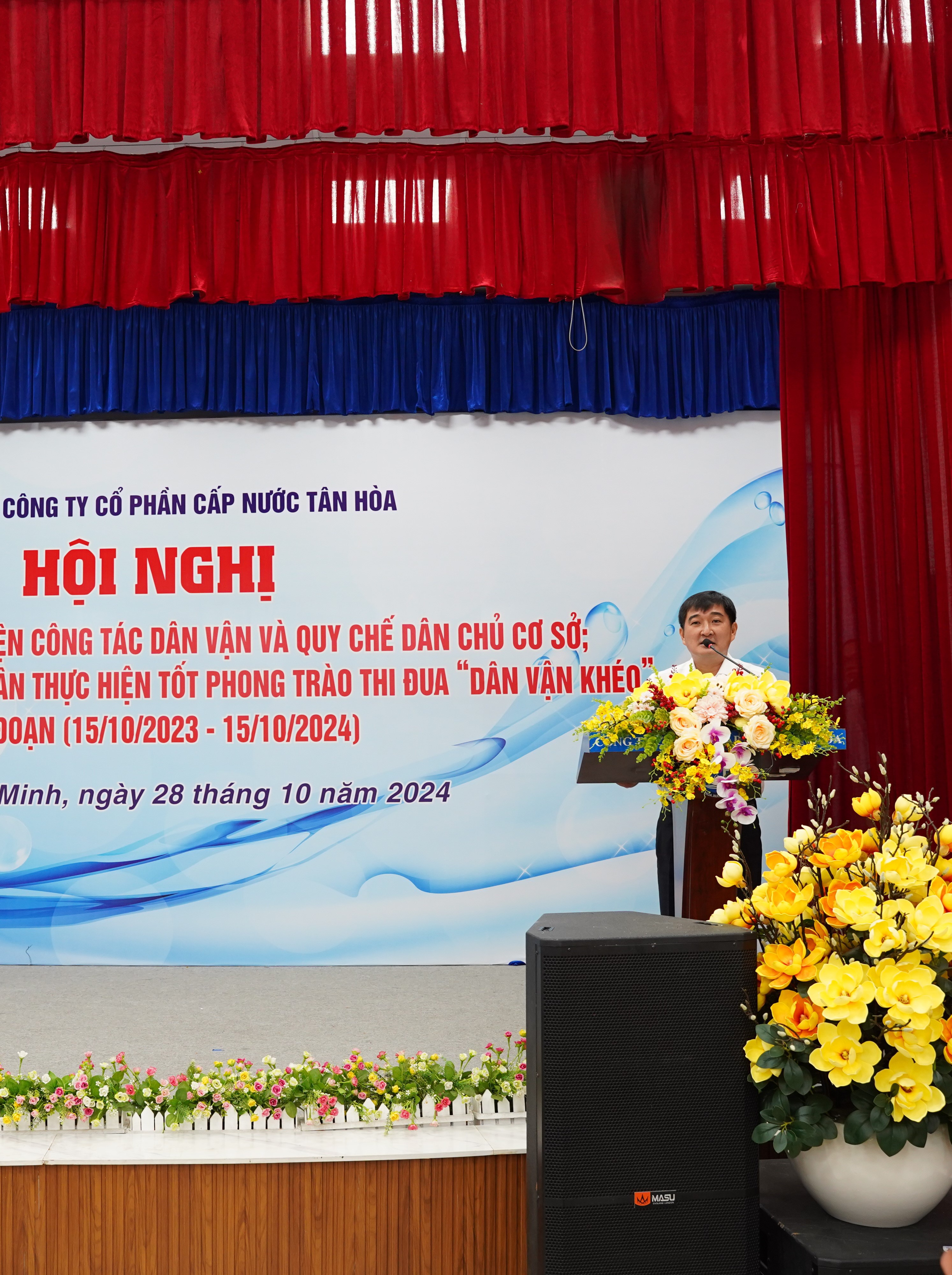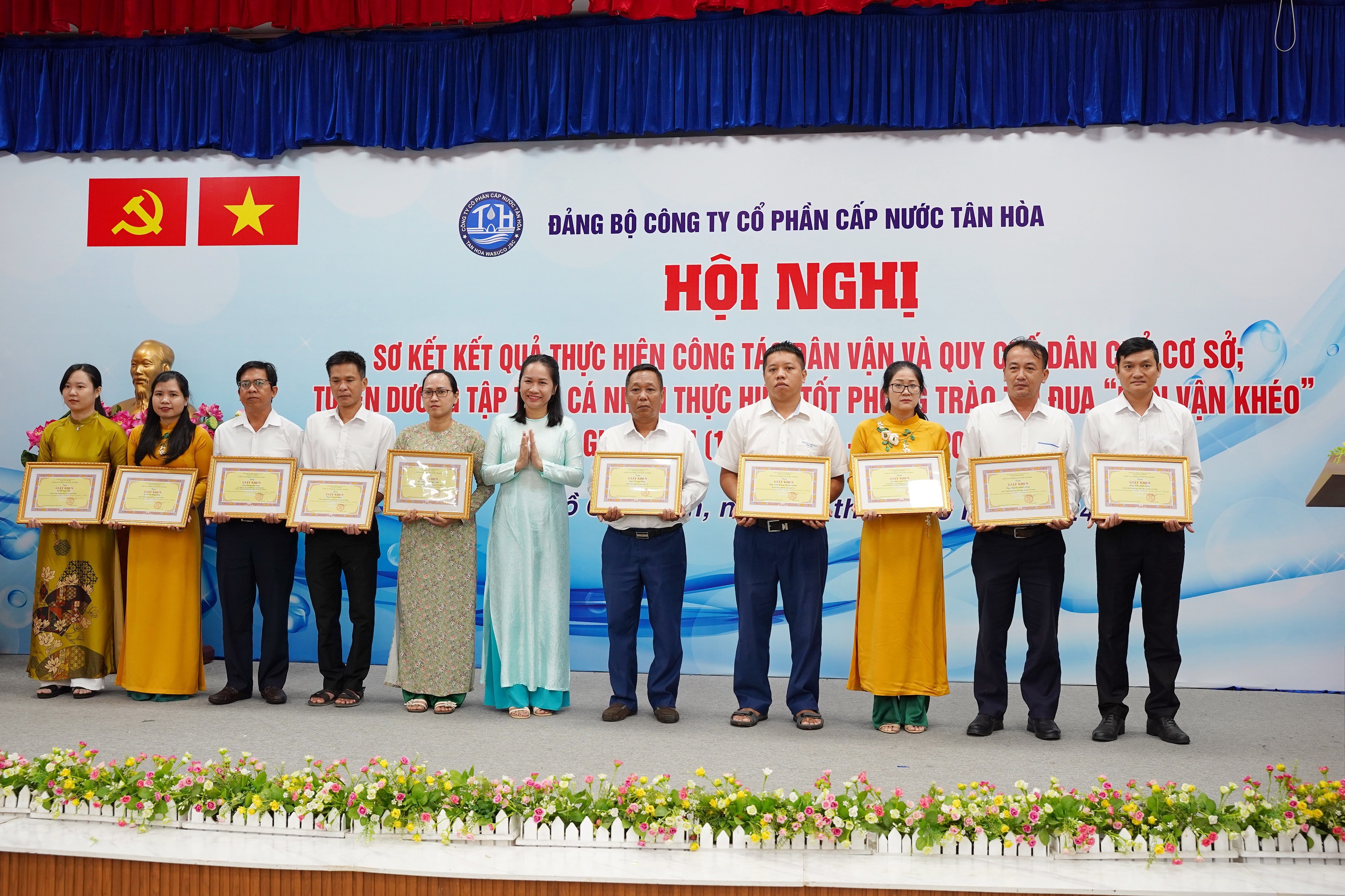 Ngày 28/10/2024, tại hội trường Công ty Cổ phần Cấp nước Tân Hòa, Hội nghị sơ kết kết quả thực hiện công tác dân vận và quy chế dân chủ cơ sở; tuyên dương tập thể, cá nhân thực hiện tốt phong trào thi đua "Dân vận khéo" giai đoạn 15/10/2023 - 15/10/2024 đã diễn ra trang trọng. Buổi lễ có sự tham dự của Đồng chí Lý Bửu Nghĩa - Phó Bí thư Thường trực Đảng ủy Tổng Công ty, Đồng chí Trần Thị Ngọc Luyến - Bí thư Đảng bộ, Chủ tịch HĐQT Công ty, Đồng chí Nguyễn Mười - Phó Bí thư Đảng bộ, Giám đốc Công ty cùng các đồng chí trong Ban Chấp hành Đảng bộ, Ủy ban Kiểm tra Đảng ủy, Trưởng Ban Kiểm soát, Trưởng Phó các Phòng – Đội; Chủ tịch, Phó chủ tịch Công đoàn; Bí thư, Phó Bí thư Đoàn Thanh niên; cùng toàn thể đảng viên của đảng bộ và đại diện các tập thể và cá nhân được biểu dương, khen thưởng cùng tham dự.
