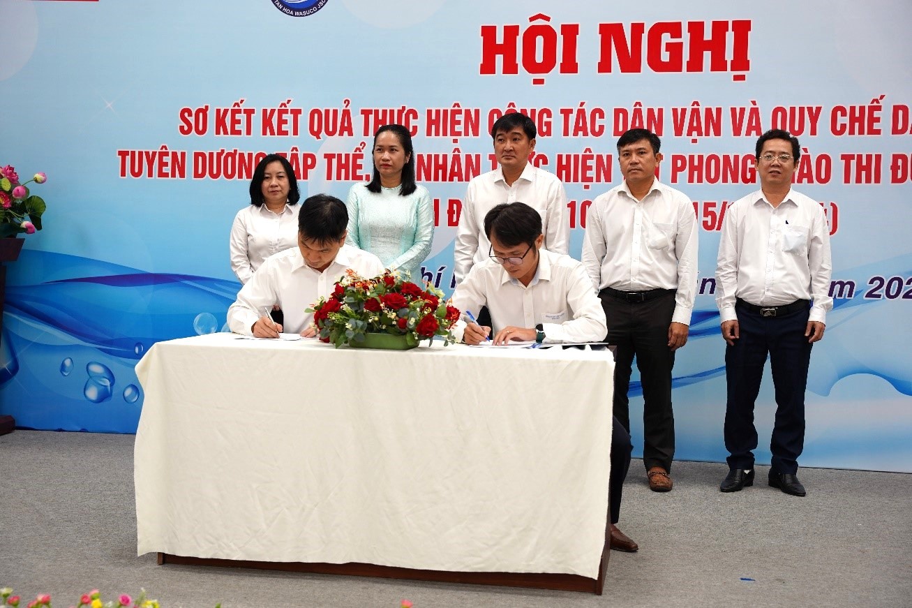 Trong khuôn khổ hội nghị, Công ty Cổ phần Cấp nước Tân Hòa đã tiến hành ký kết Giao ước thi đua đặc biệt hoàn thành nhiệm vụ sản xuất kinh doanh năm 2024. Đây là cam kết thể hiện quyết tâm cao của toàn thể cán bộ, công nhân viên trong việc hoàn thành các mục tiêu kinh doanh. Một số nội dung chính trong bản giao ước bao gồm: