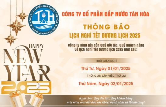 Công ty Cổ phần Cấp nước Tân Hòa xin trân trọng thông báo đến Quý khách lịch nghỉ Tết Dương lịch 2025.